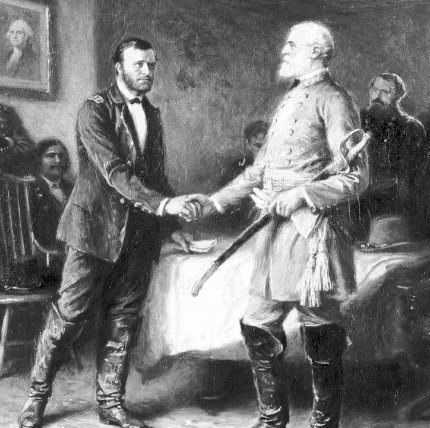 On a Palm Sunday, General Robert E. Lee surrenders to General Ulysses S. Grant at a farmhouse in the village of Appomattox Court House, Virginia.