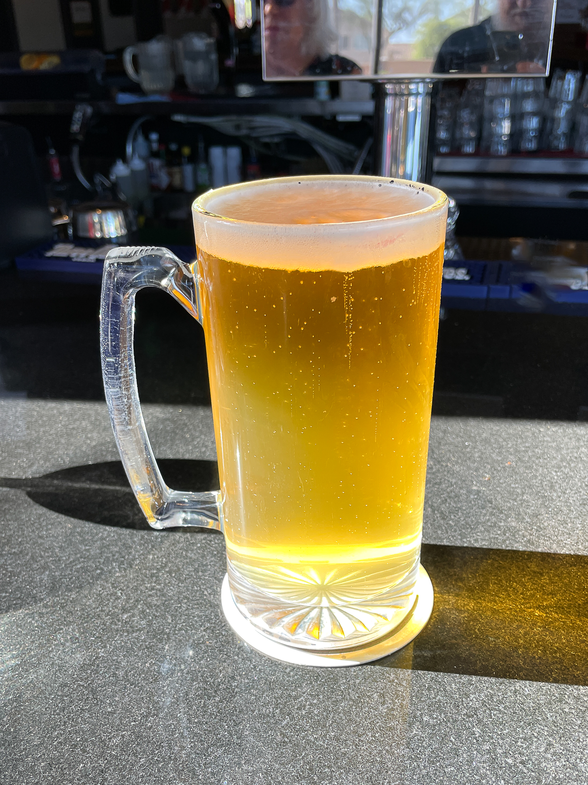Sun illuminates a glass of beer three stools from the right at my favorite tavern at exactly 4:34 PM on 20230414.